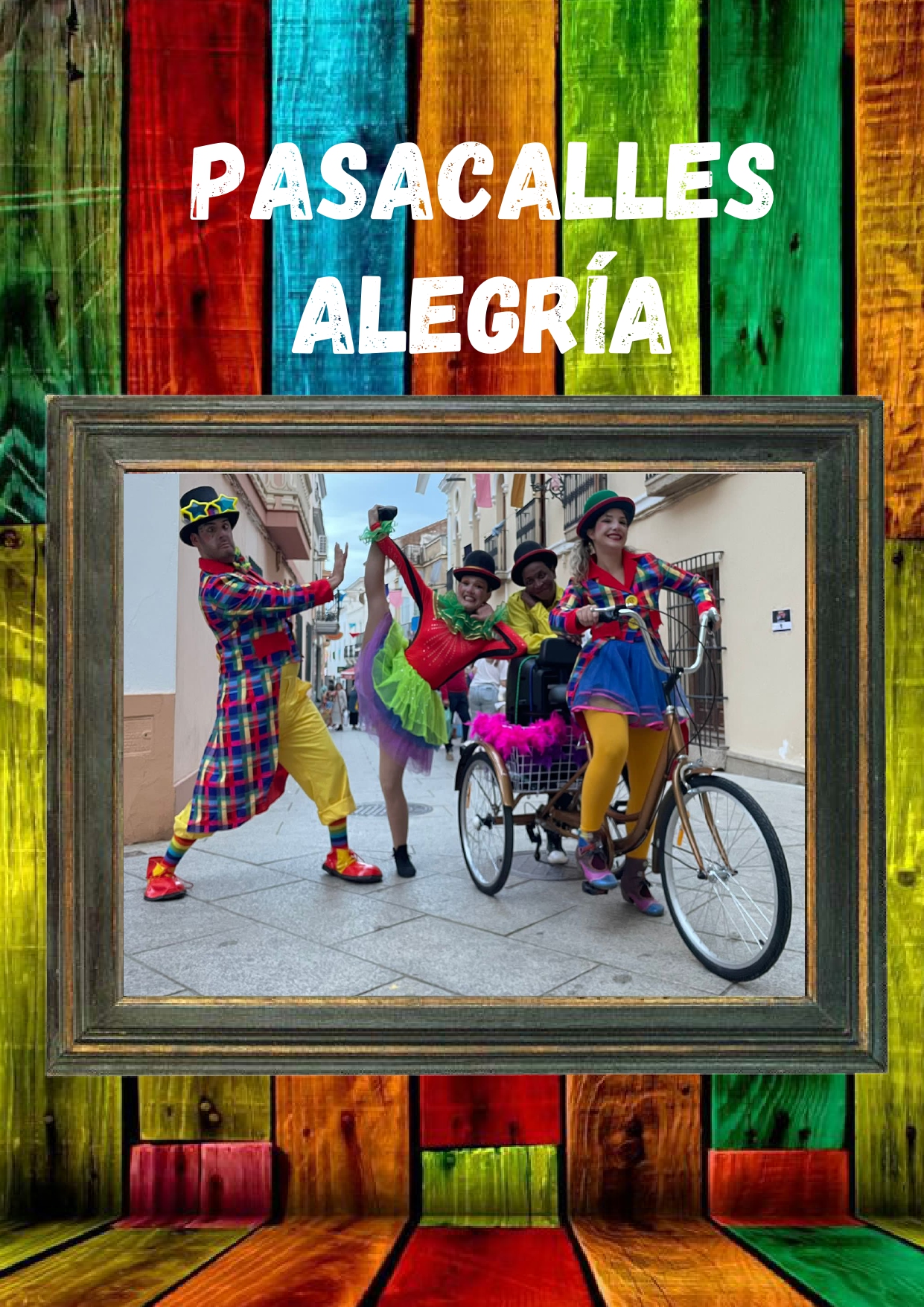 Pasacalles Alegría es un espectáculo itinerante, divertido, colorido y con mucho circo el cuál no dejará indiferente a nadie. Los personajes son divertidos y alocados en clave de payaso, con ellos podrás disfrutar de zancos rígidos, zancos power, mono ciclo, triciclo, malabares, etc, durante el recorrido. Todo el espectáculo va acompañado de música alegre y divertida. Y para terminar con un súper colofón, al final del recorrido los personajes realizan un show de animación y circo los cuales harán bailar y participar a todo el público, tanto a niños como adultos. ¡Déjate sorprender y diviértete con este espectáculo lleno ALEGRIA! Perfecto para cualquier evento y época del año.